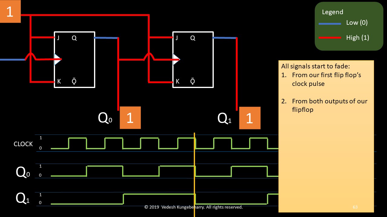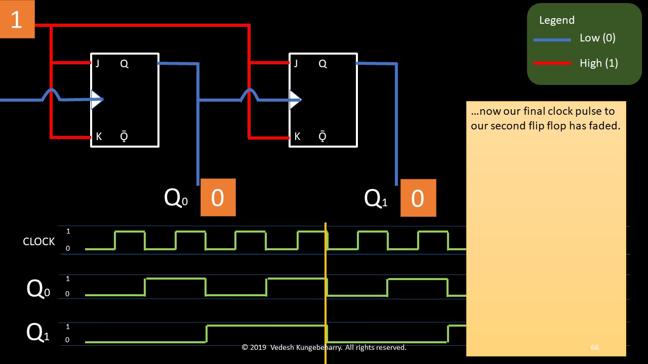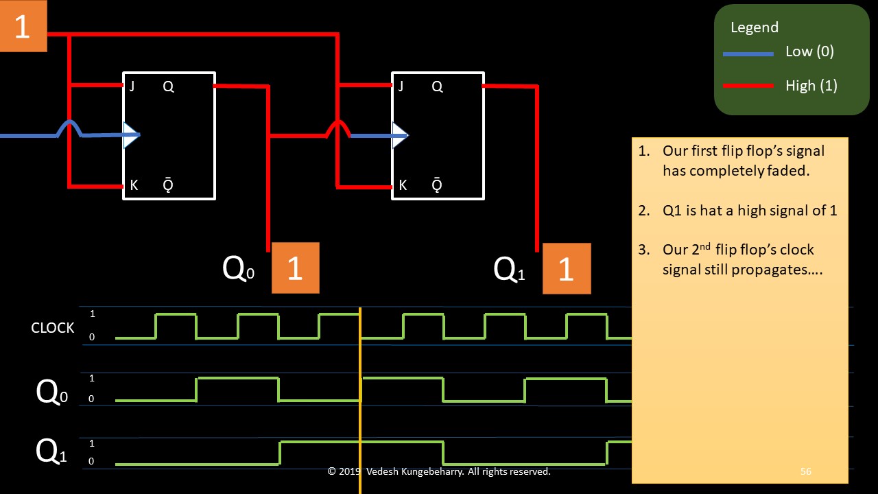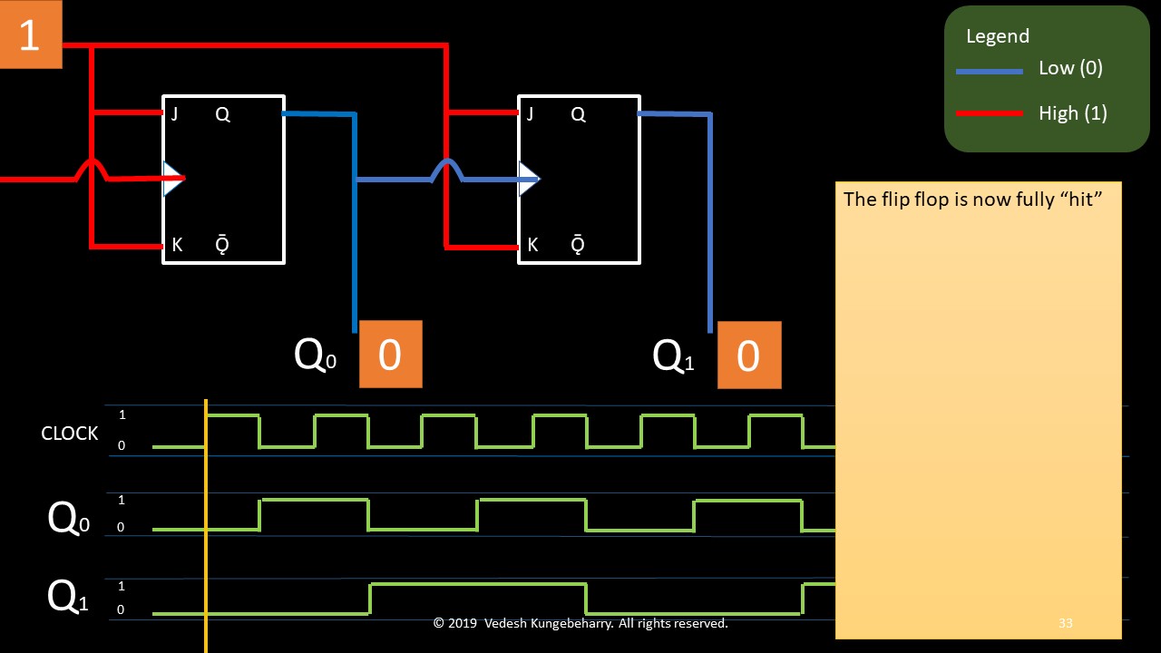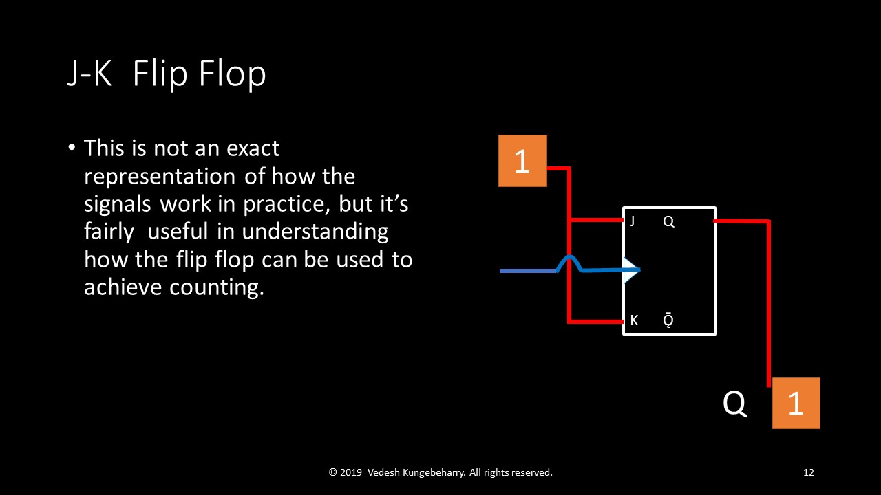 Computer Science The Ripple Counter Explained (Animation) November 21, 2019November 21, 2019 vkungeLeave a comment The Slideshow below shows how clocked JK Flipflops can be used to achieve counting. © 2019 Vedesh Kungebeharry. All rights reserved. Share this: Click to share on X (Opens in new window) X Click to share on Facebook (Opens in new window) Facebook Like Loading... Related