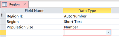 - Add a new table named Region. The design View Is shown Below: