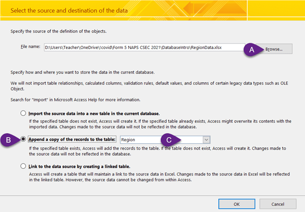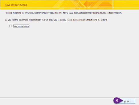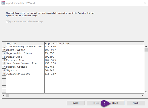 2. “RegionData.xlsx” contains data formatted to match the region and population size of our Region table. The column names are the same in both tables. Start the process to Import the data from “RegionData.xlsx”: